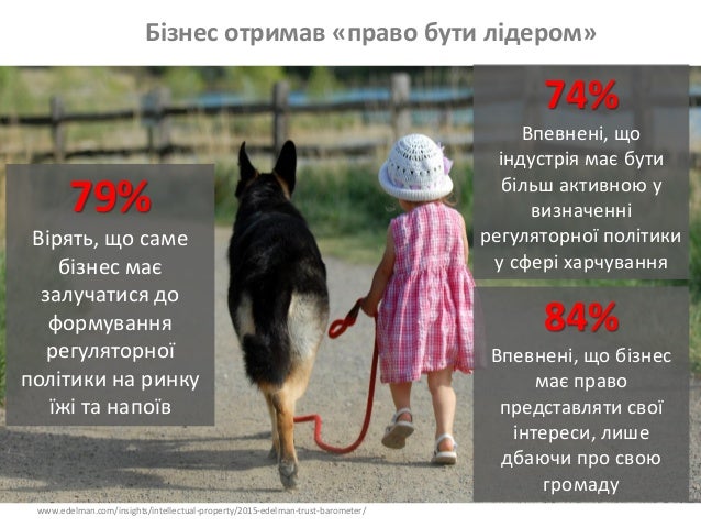 5. 5. http://www.edelman.com/insights/intellectual-property/2015-edelman-trust-barometer/ Бізнес отримав «право бути лідером» 79% Вірять, що саме бізнес має залучатися до формування регуляторної політики на ринку їжі та напоїв 84% Впевнені, що бізнес має право представляти свої інтереси, лише дбаючи про свою громаду 74% Впевнені, що індустрія має бути більш активною у визначенні регуляторної політики у сфері харчування