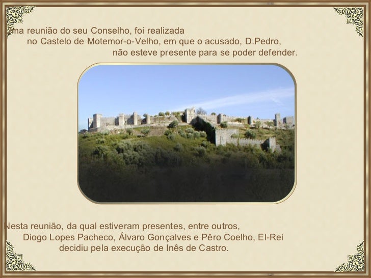 10. 10. Nesta reunião, da qual estiveram presentes, entre outros, Diogo Lopes Pacheco, Álvaro Gonçalves e Pêro Coelho, El-Rei decidiu pela execução de Inês de Castro. Uma reunião do seu Conselho, foi realizada no Castelo de Motemor-o-Velho, em que o acusado, D.Pedro, não esteve presente para se poder defender.