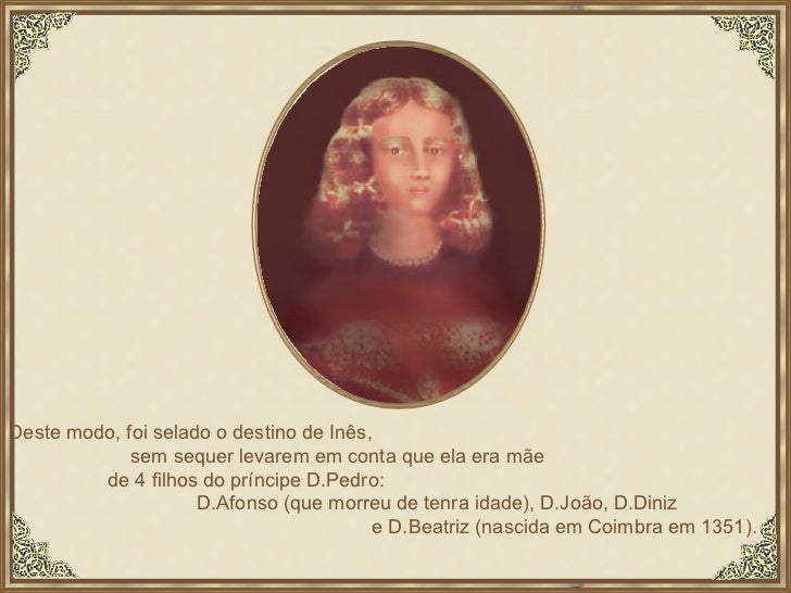 11. 11. Deste modo, foi selado o destino de Inês, sem sequer levarem em conta que ela era mãe de 4 filhos do príncipe D.Pedro: D.Afonso (que morreu de tenra idade), D.João, D.Diniz e D.Beatriz (nascida em Coimbra em 1351).