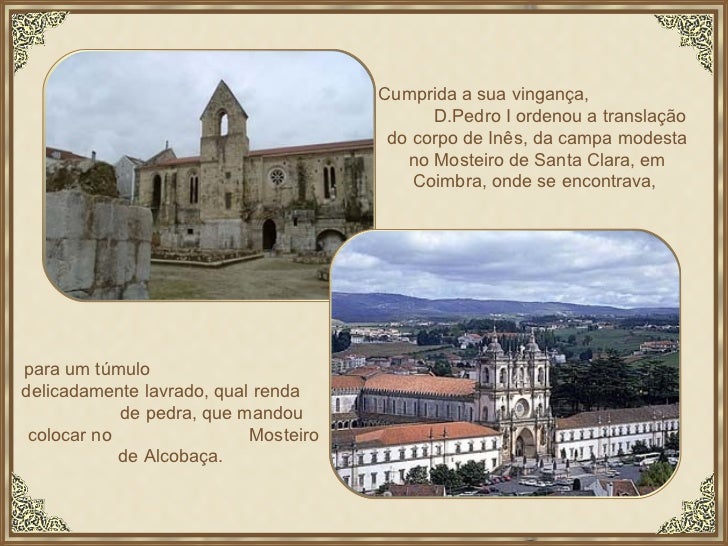 14. 14. para um túmulo delicadamente lavrado, qual renda de pedra, que mandou colocar no Mosteiro de Alcobaça. Cumprida a sua vingança, D.Pedro I ordenou a translação do corpo de Inês, da campa modesta no Mosteiro de Santa Clara, em Coimbra, onde se encontrava,