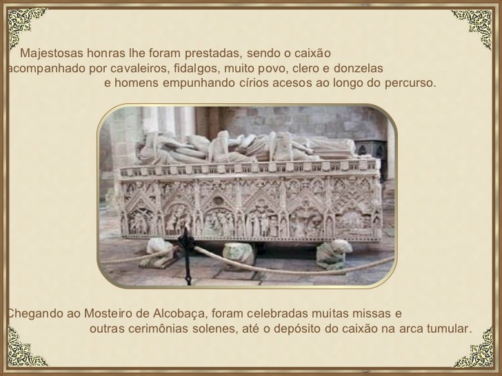 15. 15. Majestosas honras lhe foram prestadas, sendo o caixão acompanhado por cavaleiros, fidalgos, muito povo, clero e donzelas e homens empunhando círios acesos ao longo do percurso. Chegando ao Mosteiro de Alcobaça, foram celebradas muitas missas e outras cerimônias solenes, até o depósito do caixão na arca tumular.