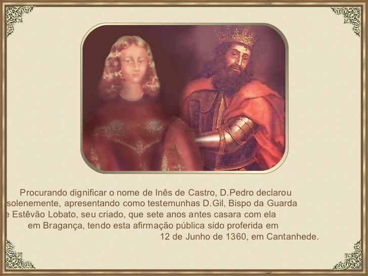 17. 17. Procurando dignificar o nome de Inês de Castro, D.Pedro declarou solenemente, apresentando como testemunhas D.Gil, Bispo da Guarda e Estêvão Lobato, seu criado, que sete anos antes casara com ela em Bragança, tendo esta afirmação pública sido proferida em 12 de Junho de 1360, em Cantanhede.