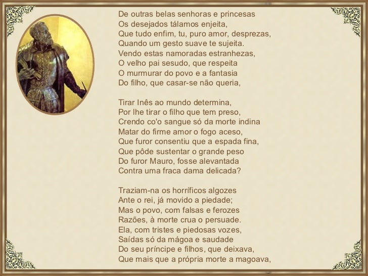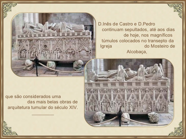 18. 18. Este inquestionável amor foi imortalizado em poemas, novelas, dramas, pinturas, esculturas, e até em composições musicais, nacionais e estrangeiras, sendo de salientar: “Terceiro Canto de Os Lusíadas, estrofes 120 a 129 ”, de Luís de Camões; “Crónicas” de Garcia de Resende; “Castro”, de António Ferreira, “Reinar después de morir”, Vélez de Guevara. Mais modernamente, “La reine mort”, de H. de Monthernland, etc.