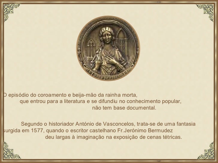 20. 20. O episódio do coroamento e beija-mão da rainha morta, que entrou para a literatura e se difundiu no conhecimento popular, não tem base documental. Segundo o historiador António de Vasconcelos, trata-se de uma fantasia surgida em 1577, quando o escritor castelhano Fr.Jerónimo Bermudez deu largas à imaginação na exposição de cenas tétricas.