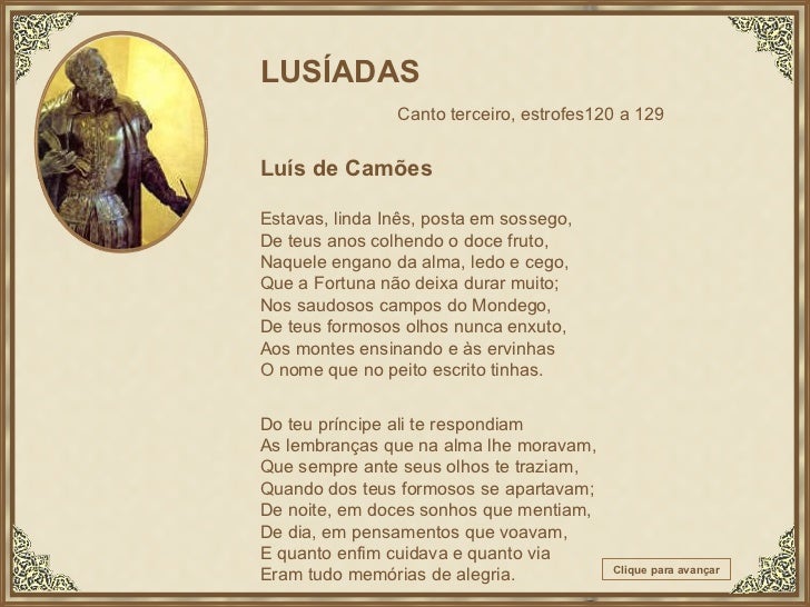 22. 22. LUSÍADAS Canto terceiro, estrofes120 a 129 Luís de Camões Estavas, linda Inês, posta em sossego, De teus anos colhendo o doce fruto, Naquele engano da alma, ledo e cego, Que a Fortuna não deixa durar muito; Nos saudosos campos do Mondego, De teus formosos olhos nunca enxuto, Aos montes ensinando e às ervinhas O nome que no peito escrito tinhas. Do teu príncipe ali te respondiam As lembranças que na alma lhe moravam, Que sempre ante seus olhos te traziam, Quando dos teus formosos se apartavam; De noite, em doces sonhos que mentiam, De dia, em pensamentos que voavam, E quanto enfim cuidava e quanto via Eram tudo memórias de alegria. Clique para avançar