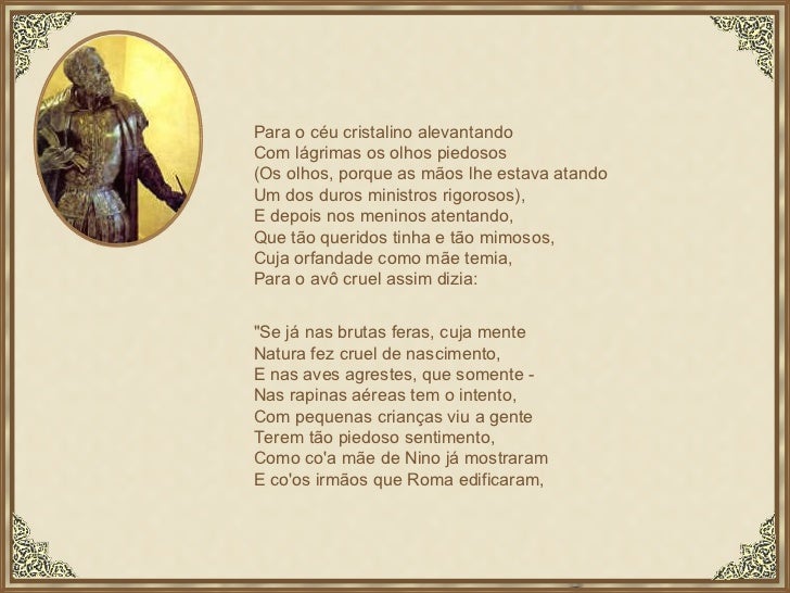 24. 24. Para o céu cristalino alevantando Com lágrimas os olhos piedosos (Os olhos, porque as mãos lhe estava atando Um dos duros ministros rigorosos), E depois nos meninos atentando, Que tão queridos tinha e tão mimosos, Cuja orfandade como mãe temia, Para o avô cruel assim dizia: "Se já nas brutas feras, cuja mente Natura fez cruel de nascimento, E nas aves agrestes, que somente - Nas rapinas aéreas tem o intento, Com pequenas crianças viu a gente Terem tão piedoso sentimento, Como co'a mãe de Nino já mostraram E co'os irmãos que Roma edificaram,