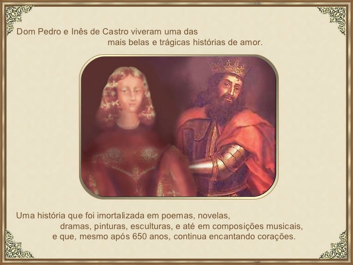 3. 3. Uma história que foi imortalizada em poemas, novelas, dramas, pinturas, esculturas, e até em composições musicais, e que, mesmo após 650 anos, continua encantando corações. Dom Pedro e Inês de Castro viveram uma das mais belas e trágicas histórias de amor.
