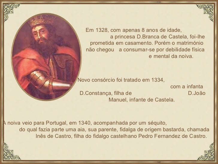 5. 5. Em 1328, com apenas 8 anos de idade, a princesa D.Branca de Castela, foi-lhe prometida em casamento. Porém o matrimónio não chegou a consumar-se por debilidade física e mental da noiva. Novo consórcio foi tratado em 1334, com a infanta D.Constança, filha de D.João Manuel, infante de Castela. A noiva veio para Portugal, em 1340, acompanhada por um séquito, do qual fazia parte uma aia, sua parente, fidalga de origem bastarda, chamada Inês de Castro, filha do fidalgo castelhano Pedro Fernandez de Castro.