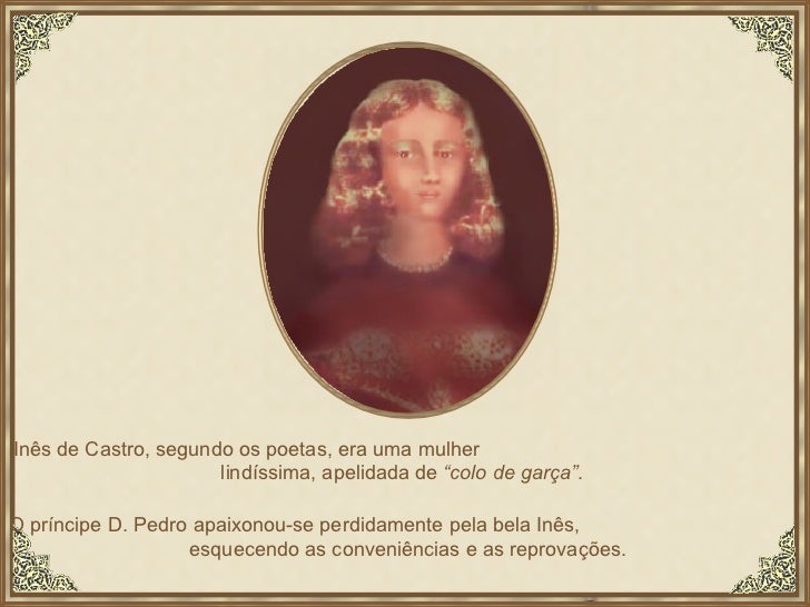 6. 6. Inês de Castro, segundo os poetas, era uma mulher lindíssima, apelidada de “colo de garça” . O príncipe D. Pedro apaixonou-se perdidamente pela bela Inês, esquecendo as conveniências e as reprovações.