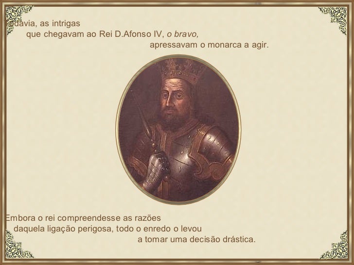 9. 9. Embora o rei compreendesse as razões daquela ligação perigosa, todo o enredo o levou a tomar uma decisão drástica. Todavia, as intrigas que chegavam ao Rei D.Afonso IV, o bravo, apressavam o monarca a agir.