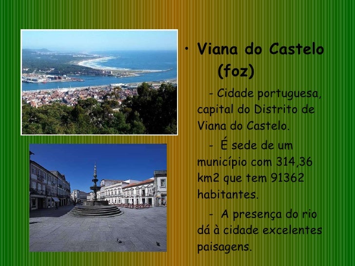10. 10. <ul><li>Viana do Castelo (foz) </li></ul><ul><li>- Cidade portuguesa, capital do Distrito de Viana do Castelo. </li></ul><ul><li>- É sede de um município com 314,36 km2 que tem 91362 habitantes. </li></ul><ul><li>- A presença do rio dá à cidade excelentes paisagens. </li></ul>