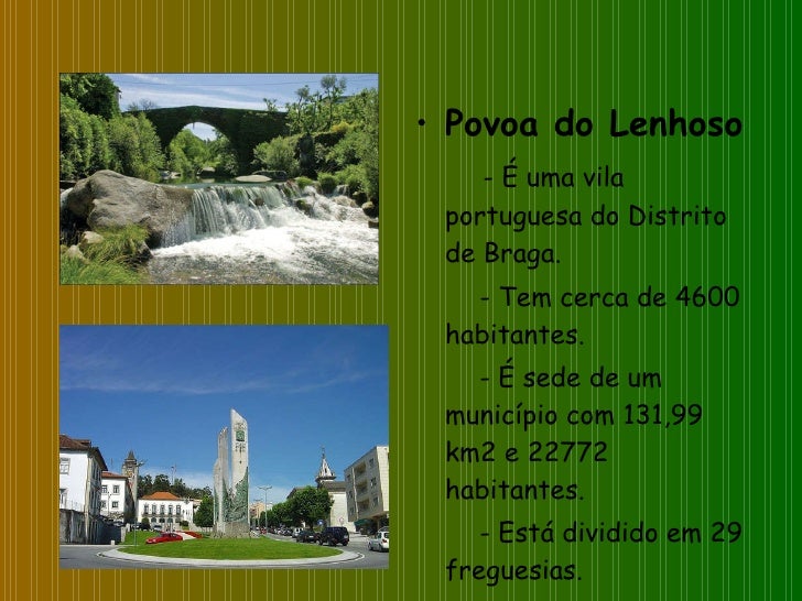 13. 13. <ul><li>Povoa do Lenhoso </li></ul><ul><li>- É uma vila portuguesa do Distrito de Braga. </li></ul><ul><li>- Tem cerca de 4600 habitantes. </li></ul><ul><li>- É sede de um município com 131,99 km2 e 22772 habitantes. </li></ul><ul><li>- Está dividido em 29 freguesias. </li></ul>