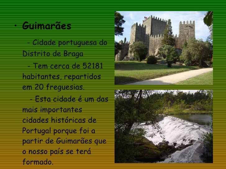 17. 17. <ul><li>Guimarães </li></ul><ul><li>- Cidade portuguesa do Distrito de Braga </li></ul><ul><li>- Tem cerca de 52181 habitantes, repartidos em 20 freguesias. </li></ul><ul><li>- Esta cidade é um das mais importantes cidades históricas de Portugal porque foi a partir de Guimarães que o nosso país se terá formado. </li></ul>