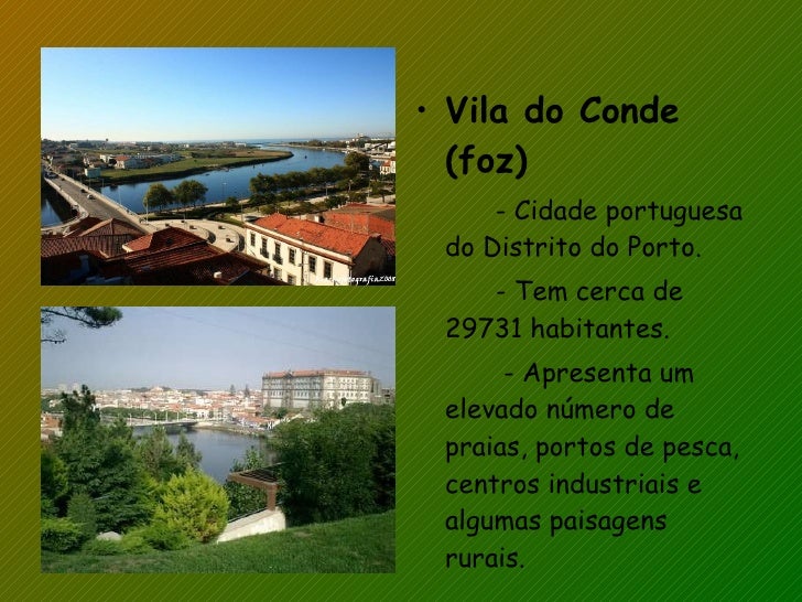 18. 18. <ul><li>Vila do Conde (foz) </li></ul><ul><li>- Cidade portuguesa do Distrito do Porto. </li></ul><ul><li>- Tem cerca de 29731 habitantes. </li></ul><ul><li>- Apresenta um elevado número de praias, portos de pesca, centros industriais e algumas paisagens rurais. </li></ul>