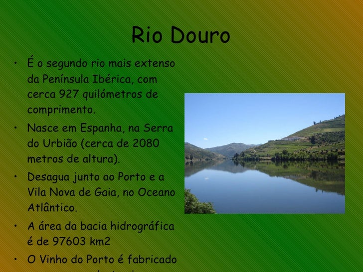 19. 19. Rio Douro <ul><li>É o segundo rio mais extenso da Península Ibérica, com cerca 927 quilómetros de comprimento. </li></ul><ul><li>Nasce em Espanha, na Serra do Urbião (cerca de 2080 metros de altura). </li></ul><ul><li>Desagua junto ao Porto e a Vila Nova de Gaia, no Oceano Atlântico. </li></ul><ul><li>A área da bacia hidrográfica é de 97603 km2 </li></ul><ul><li>O Vinho do Porto é fabricado nas margens deste rio. </li></ul>