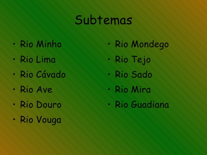 2. 2. Subtemas <ul><li>Rio Minho </li></ul><ul><li>Rio Lima </li></ul><ul><li>Rio Cávado </li></ul><ul><li>Rio Ave </li></ul><ul><li>Rio Douro </li></ul><ul><li>Rio Vouga </li></ul><ul><li>Rio Mondego </li></ul><ul><li>Rio Tejo </li></ul><ul><li>Rio Sado </li></ul><ul><li>Rio Mira </li></ul><ul><li>Rio Guadiana </li></ul>