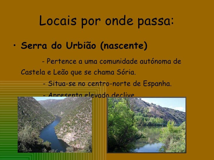 20. 20. Locais por onde passa: <ul><li>Serra do Urbião (nascente) </li></ul><ul><li>- Pertence a uma comunidade autónoma de Castela e Leão que se chama Sória. </li></ul><ul><li>- Situa-se no centro-norte de Espanha. </li></ul><ul><li>- Apresenta elevado declive </li></ul>