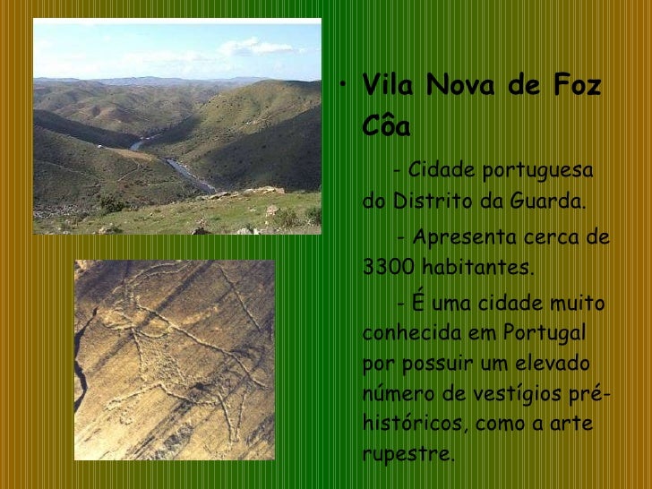 21. 21. <ul><li>Vila Nova de Foz Côa </li></ul><ul><li>- Cidade portuguesa do Distrito da Guarda. </li></ul><ul><li>- Apresenta cerca de 3300 habitantes. </li></ul><ul><li>- É uma cidade muito conhecida em Portugal por possuir um elevado número de vestígios pré-históricos, como a arte rupestre. </li></ul>
