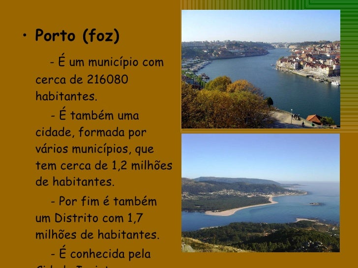 22. 22. <ul><li>Porto (foz) </li></ul><ul><li>- É um município com cerca de 216080 habitantes. </li></ul><ul><li>- É também uma cidade, formada por vários municípios, que tem cerca de 1,2 milhões de habitantes. </li></ul><ul><li>- Por fim é também um Distrito com 1,7 milhões de habitantes. </li></ul><ul><li>- É conhecida pela Cidade Invicta. </li></ul>