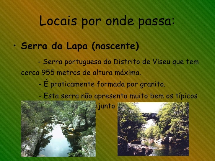 24. 24. Locais por onde passa: <ul><li>Serra da Lapa (nascente) </li></ul><ul><li>- Serra portuguesa do Distrito de Viseu que tem cerca 955 metros de altura máxima. </li></ul><ul><li>- É praticamente formada por granito. </li></ul><ul><li>- Esta serra não apresenta muito bem os típicos montes mas sim um conjunto de pedregulhos. </li></ul>