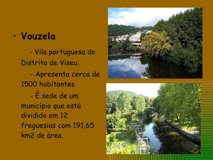 25. 25. <ul><li>Vouzela </li></ul><ul><li>- Vila portuguesa do Distrito de Viseu. </li></ul><ul><li>- Apresenta cerca de 1500 habitantes. </li></ul><ul><li>- É sede de um município que está dividido em 12 freguesias com 191,65 km2 de área. </li></ul>