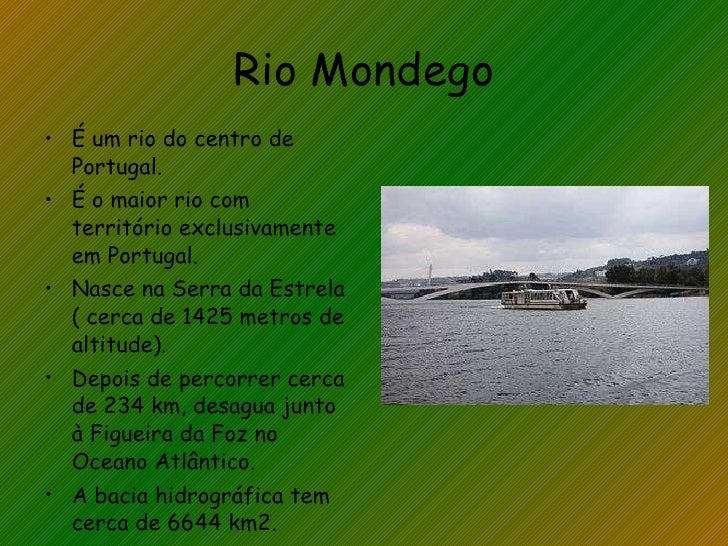 27. 27. Rio Mondego <ul><li>É um rio do centro de Portugal. </li></ul><ul><li>É o maior rio com território exclusivamente em Portugal. </li></ul><ul><li>Nasce na Serra da Estrela ( cerca de 1425 metros de altitude). </li></ul><ul><li>Depois de percorrer cerca de 234 km, desagua junto à Figueira da Foz no Oceano Atlântico. </li></ul><ul><li>A bacia hidrográfica tem cerca de 6644 km2. </li></ul>