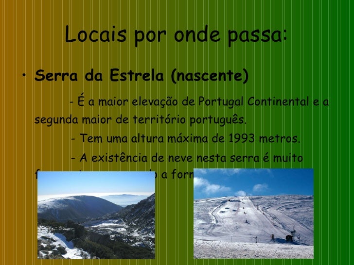 28. 28. Locais por onde passa: <ul><li>Serra da Estrela (nascente) </li></ul><ul><li>- É a maior elevação de Portugal Continental e a segunda maior de território português. </li></ul><ul><li>- Tem uma altura máxima de 1993 metros. </li></ul><ul><li>- A existência de neve nesta serra é muito frequente, provocando a formação de nevoeiro. </li></ul>