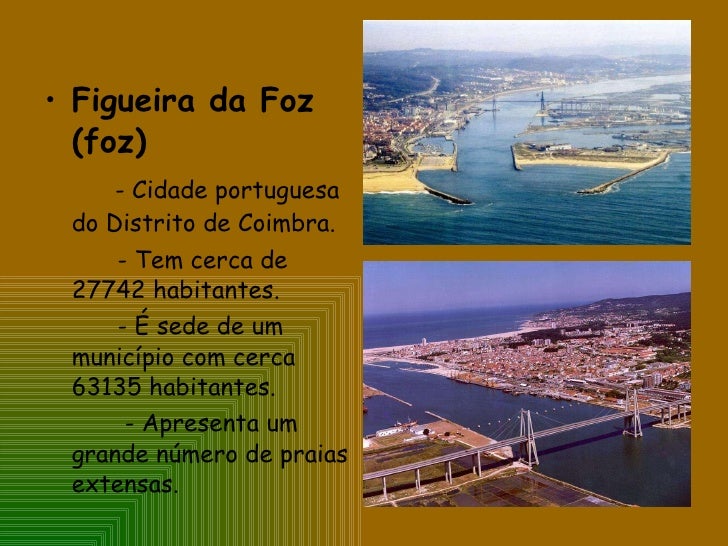30. 30. <ul><li>Figueira da Foz (foz) </li></ul><ul><li>- Cidade portuguesa do Distrito de Coimbra. </li></ul><ul><li>- Tem cerca de 27742 habitantes. </li></ul><ul><li>- É sede de um município com cerca 63135 habitantes. </li></ul><ul><li>- Apresenta um grande número de praias extensas. </li></ul>
