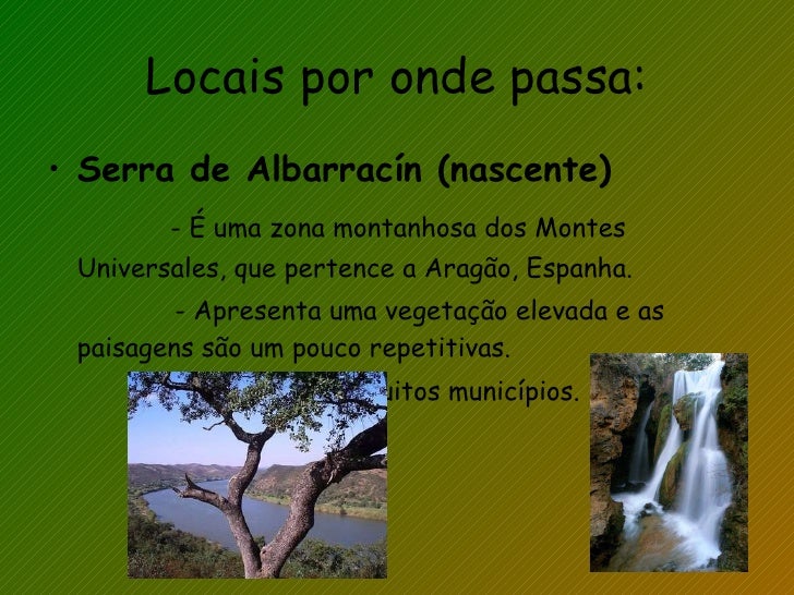 32. 32. Locais por onde passa: <ul><li>Serra de Albarracín (nascente) </li></ul><ul><li>- É uma zona montanhosa dos Montes Universales, que pertence a Aragão, Espanha. </li></ul><ul><li>- Apresenta uma vegetação elevada e as paisagens são um pouco repetitivas. </li></ul><ul><li>- Divide-se em muitos municípios. </li></ul>