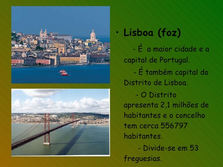 34. 34. <ul><li>Lisboa (foz) </li></ul><ul><li>- É a maior cidade e a capital de Portugal. </li></ul><ul><li>- É também capital do Distrito de Lisboa. </li></ul><ul><li>- O Distrito apresenta 2,1 milhões de habitantes e o concelho tem cerca 556797 habitantes. </li></ul><ul><li>- Divide-se em 53 freguesias. </li></ul>