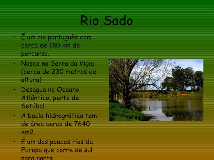 35. 35. Rio Sado <ul><li>É um rio português com cerca de 180 km de percurso. </li></ul><ul><li>Nasce na Serra da Vigia (cerca de 230 metros de altura) </li></ul><ul><li>Desagua no Oceano Atlântico, perto de Setúbal. </li></ul><ul><li>A bacia hidrográfica tem de área cerca de 7640 km2. </li></ul><ul><li>É um dos poucos rios da Europa que corre de sul para norte. </li></ul>