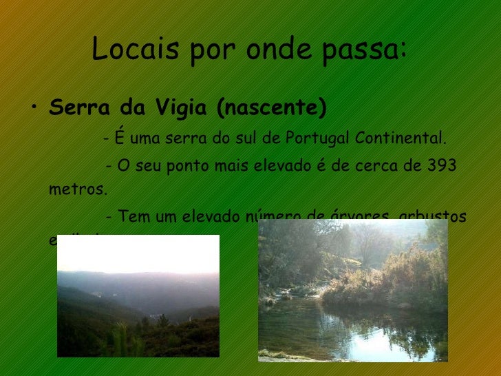 36. 36. Locais por onde passa: <ul><li>Serra da Vigia (nascente) </li></ul><ul><li>- É uma serra do sul de Portugal Continental. </li></ul><ul><li>- O seu ponto mais elevado é de cerca de 393 metros. </li></ul><ul><li>- Tem um elevado número de árvores, arbustos e ribeiros. </li></ul>
