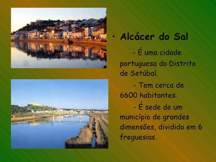37. 37. <ul><li>Alcácer do Sal </li></ul><ul><li>- É uma cidade portuguesa do Distrito de Setúbal. </li></ul><ul><li>- Tem cerca de 6600 habitantes. </li></ul><ul><li>- É sede de um município de grandes dimensões, dividido em 6 freguesias. </li></ul>