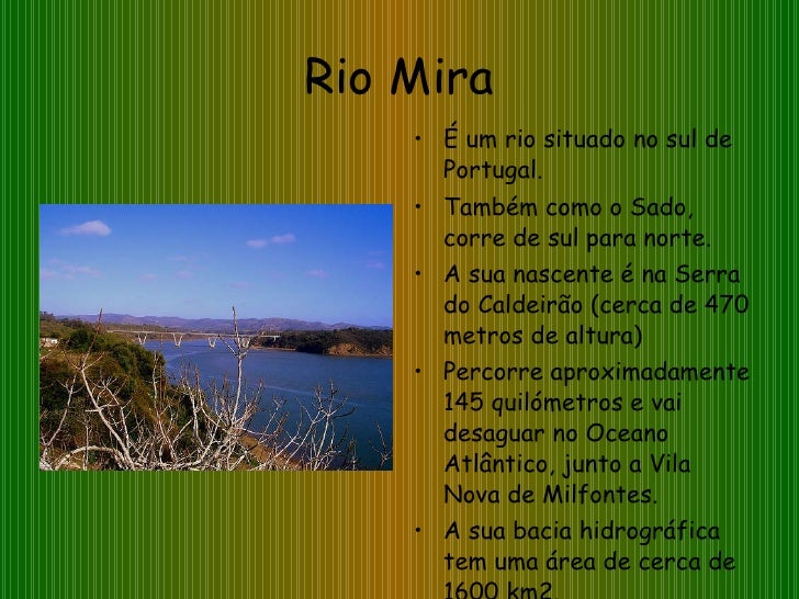39. 39. Rio Mira <ul><li>É um rio situado no sul de Portugal. </li></ul><ul><li>Também como o Sado, corre de sul para norte. </li></ul><ul><li>A sua nascente é na Serra do Caldeirão (cerca de 470 metros de altura) </li></ul><ul><li>Percorre aproximadamente 145 quilómetros e vai desaguar no Oceano Atlântico, junto a Vila Nova de Milfontes. </li></ul><ul><li>A sua bacia hidrográfica tem uma área de cerca de 1600 km2. </li></ul>