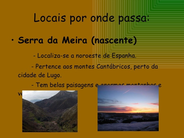 4. 4. Locais por onde passa: <ul><li>Serra da Meira (nascente) </li></ul><ul><li>- Localiza-se a noroeste de Espanha. </li></ul><ul><li>- Pertence aos montes Cantábricos, perto da cidade de Lugo. </li></ul><ul><li>- Tem belas paisagens e enormes montanhas e vegetações. </li></ul>