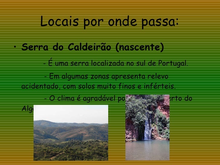 40. 40. Locais por onde passa: <ul><li>Serra do Caldeirão (nascente) </li></ul><ul><li>- É uma serra localizada no sul de Portugal. </li></ul><ul><li>- Em algumas zonas apresenta relevo acidentado, com solos muito finos e inférteis. </li></ul><ul><li>- O clima é agradável por se situar perto do Algarve. </li></ul>