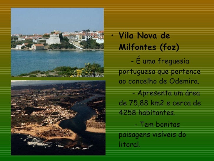 42. 42. <ul><li>Vila Nova de Milfontes (foz) </li></ul><ul><li>- É uma freguesia portuguesa que pertence ao concelho de Odemira. </li></ul><ul><li>- Apresenta um área de 75,88 km2 e cerca de 4258 habitantes. </li></ul><ul><li>- Tem bonitas paisagens visíveis do litoral. </li></ul>
