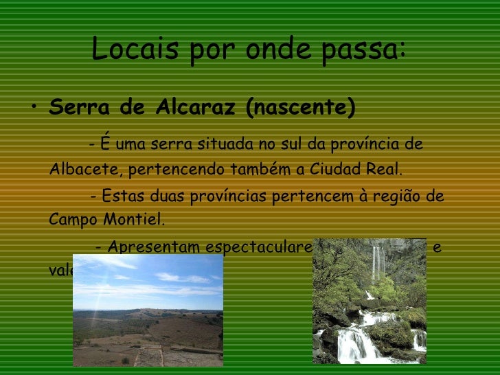 44. 44. Locais por onde passa: <ul><li>Serra de Alcaraz (nascente) </li></ul><ul><li>- É uma serra situada no sul da província de Albacete, pertencendo também a Ciudad Real. </li></ul><ul><li>- Estas duas províncias pertencem à região de Campo Montiel. </li></ul><ul><li>- Apresentam espectaculares desfiladeiros e vales férteis. </li></ul>