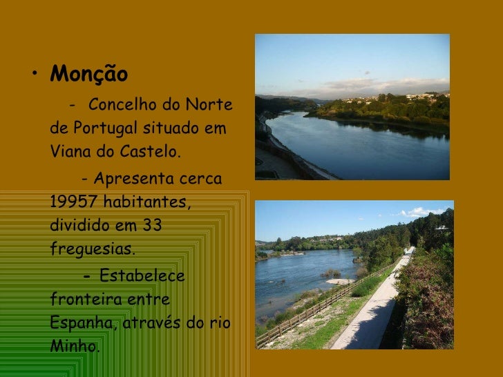 5. 5. <ul><li>Monção </li></ul><ul><li>- Concelho do Norte de Portugal situado em Viana do Castelo. </li></ul><ul><li>- Apresenta cerca 19957 habitantes, dividido em 33 freguesias. </li></ul><ul><li>- Estabelece fronteira entre Espanha, através do rio Minho. </li></ul>