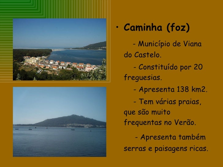 6. 6. <ul><li>Caminha (foz) </li></ul><ul><li>- Município de Viana do Castelo. </li></ul><ul><li>- Constituído por 20 freguesias. </li></ul><ul><li>- Apresenta 138 km2. </li></ul><ul><li>- Tem várias praias, que são muito frequentas no Verão. </li></ul><ul><li>- Apresenta também serras e paisagens ricas. </li></ul>