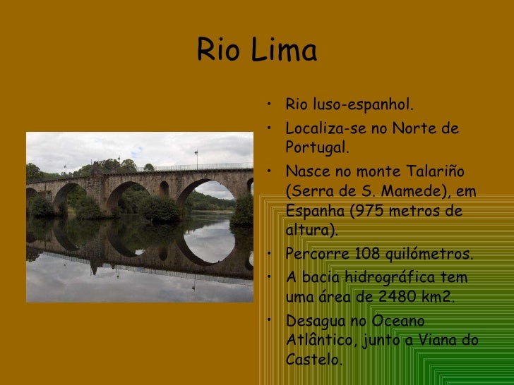 7. 7. Rio Lima <ul><li>Rio luso-espanhol. </li></ul><ul><li>Localiza-se no Norte de Portugal. </li></ul><ul><li>Nasce no monte Talariño (Serra de S. Mamede), em Espanha (975 metros de altura). </li></ul><ul><li>Percorre 108 quilómetros. </li></ul><ul><li>A bacia hidrográfica tem uma área de 2480 km2. </li></ul><ul><li>Desagua no Oceano Atlântico, junto a Viana do Castelo. </li></ul>