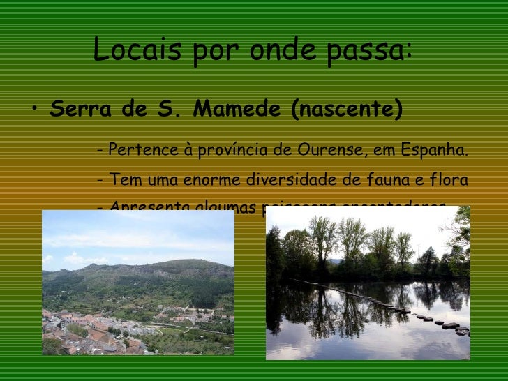 8. 8. Locais por onde passa: <ul><li>Serra de S. Mamede (nascente) </li></ul><ul><li>- Pertence à província de Ourense, em Espanha. </li></ul><ul><li>- Tem uma enorme diversidade de fauna e flora </li></ul><ul><li>- Apresenta algumas paisagens encantadoras. </li></ul>