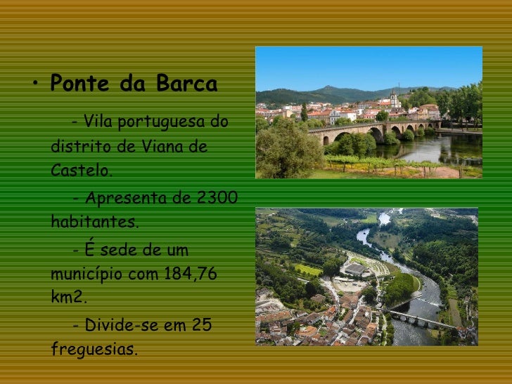 9. 9. <ul><li>Ponte da Barca </li></ul><ul><li>- Vila portuguesa do distrito de Viana de Castelo. </li></ul><ul><li>- Apresenta de 2300 habitantes. </li></ul><ul><li>- É sede de um município com 184,76 km2. </li></ul><ul><li>- Divide-se em 25 freguesias. </li></ul>