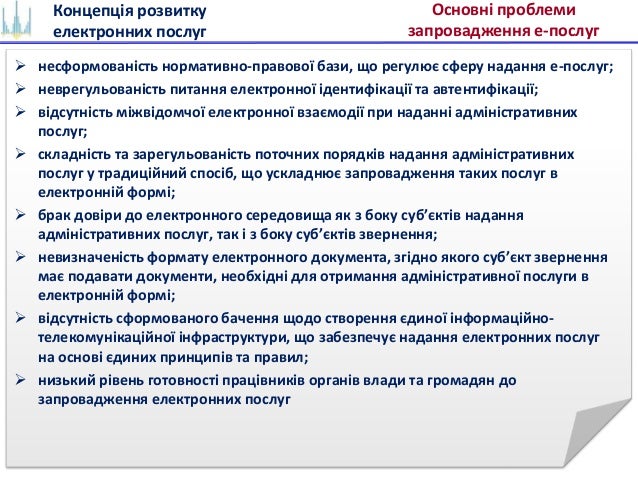 2. 2. Концепція розвитку електронних послуг Основні проблеми запровадження е-послуг  несформованість нормативно-правової бази, що регулює сферу надання е-послуг;  неврегульованість питання електронної ідентифікації та автентифікації;  відсутність міжвідомчої електронної взаємодії при наданні адміністративних послуг;  складність та зарегульованість поточних порядків надання адміністративних послуг у традиційний спосіб, що ускладнює запровадження таких послуг в електронній формі;  брак довіри до електронного середовища як з боку суб’єктів надання адміністративних послуг, так і з боку суб’єктів звернення;  невизначеність формату електронного документа, згідно якого суб’єкт звернення має подавати документи, необхідні для отримання адміністративної послуги в електронній формі;  відсутність сформованого бачення щодо створення єдиної інформаційно- телекомунікаційної інфраструктури, що забезпечує надання електронних послуг на основі єдиних принципів та правил;  низький рівень готовності працівників органів влади та громадян до запровадження електронних послуг