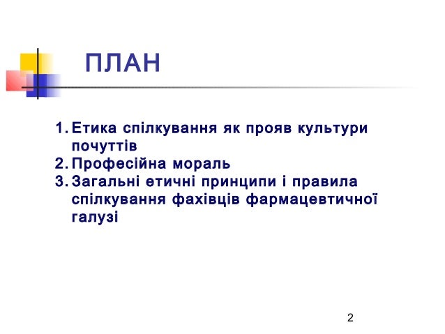 2. 2. 2 ПЛАН 1. Етика спілкування як прояв культури почуттів 2. Професійна мораль 3. Загальні етичні принципи і правила спілкування фахівців фармацевтичної галузі