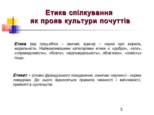 3. 3. 3 Етика спілкуванняЕтика спілкування як прояв культури почуттівяк прояв культури почуттів Етика (від грец.ethos – звичай, вдача) – наука про мораль, моральність. Найважливішими категоріями етики є «добро», «зло», «справедливість», «благо», «відповідальність», обов’язок», «совість» тощо. Етикет - (слово французького походження, означає «ярлик») - норма поведінки. До нього відносяться правила чемності і ввічливості, прийняті в суспільстві.