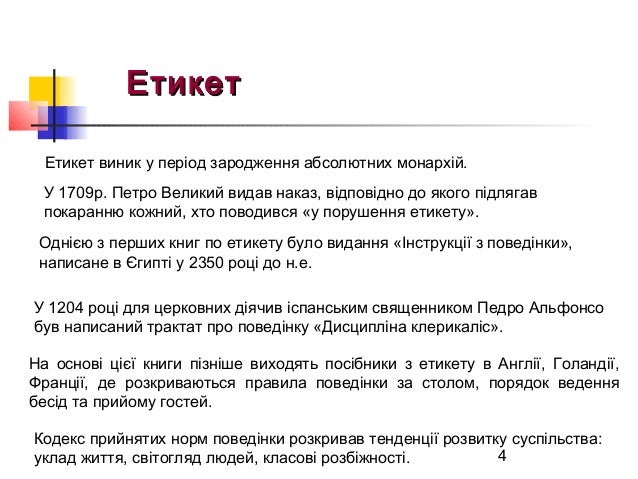 4. 4. 4 Етикет виник у період зародження абсолютних монархій. ЕтикетЕтикет У 1709р. Петро Великий видав наказ, відповідно до якого підлягав покаранню кожний, хто поводився «у порушення етикету». Однією з перших книг по етикету було видання «Інструкції з поведінки», написане в Єгипті у 2350 році до н.е. У 1204 році для церковних діячив іспанським священником Педро Альфонсо був написаний трактат про поведінку «Дисципліна клерикаліс». На основі цієї книги пізніше виходять посібники з етикету в Англії, Голандії, Франції, де розкриваються правила поведінки за столом, порядок ведення бесід та прийому гостей. Кодекс прийнятих норм поведінки розкривав тенденції розвитку суспільства: уклад життя, світогляд людей, класові розбіжності.