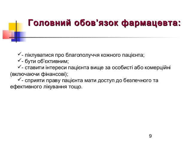 9. 9. 9 Головний обов’язок фармацевта:Головний обов’язок фармацевта: - піклуватися про благополуччя кожного пацієнта; - бути об’єктивним; - ставити інтереси пацієнта вище за особисті або комерційні (включаючи фінансові); - сприяти праву пацієнта мати доступ до безпечного та ефективного лікування тощо.
