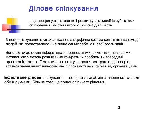 3. 3. 3 Ділове спілкування Ділове спілкування визначається як специфічна форма контактів і взаємодії людей, які представляють не лише самих себе, а й свої організації. Воно включає обмін інформацією, пропозиціями, вимогами, поглядами, мотивацією з метою розв'язання конкретних проблем як всередині організації, так і за її межами, а також укладення контрактів, договорів, встановлення інших відносин між підприємствами, фірмами, організаціями. Ефективне ділове спілкування — це не стільки обмін значеннями, скільки обмін думками. Більше того, це пошук спільного рішення. – це процес установлення і розвитку взаємодії із суб’єктами спілкування, змістом якого є сумісна діяльність