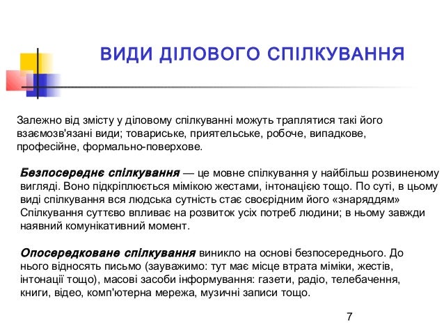 7. 7. 7 ВИДИ ДІЛОВОГО СПІЛКУВАННЯ Залежно від змісту у діловому спілкуванні можуть траплятися такі його взаємозв'язані види; товариське, приятельське, робоче, випадкове, професійне, формально-поверхове. Безпосереднє спілкування — це мовне спілкування у найбільш розвиненому вигляді. Воно підкріплюється мімікою жестами, інтонацією тощо. По суті, в цьому виді спілкування вся людська сутність стає своєрідним його «знаряддям» Спілкування суттєво впливає на розвиток усіх потреб людини; в ньому завжди наявний комунікативний момент. Опосередковане спілкування виникло на основі безпосереднього. До нього відносять письмо (зауважимо: тут має місце втрата міміки, жестів, інтонації тощо), масові засоби інформування: газети, радіо, телебачення, книги, відео, комп'ютерна мережа, музичні записи тощо.